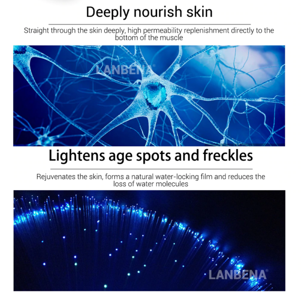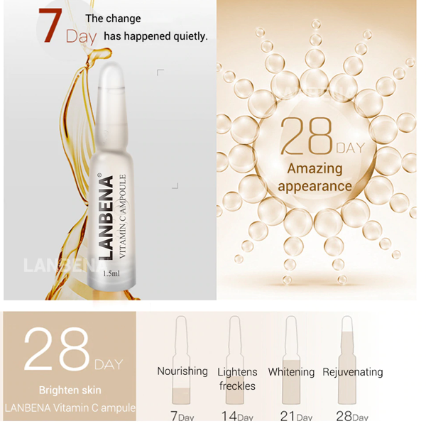 LANBENA Vitamin C serum is specially made for freckles treatment and skin brightness. It improves the skin dullness and dryness, prevents oxidation and nourish the skin deeply. One pack contains 7 bottles in a shape of ampule.  The serum inside bottle should be used only externally on the skin one bottle per day. The serum produce the following effect during certain period of time.